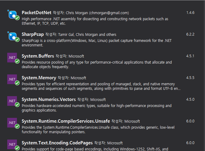 프로젝트 -> NuGet패키지관리 -> 찾아보기탭 -> SharpPcap 설치