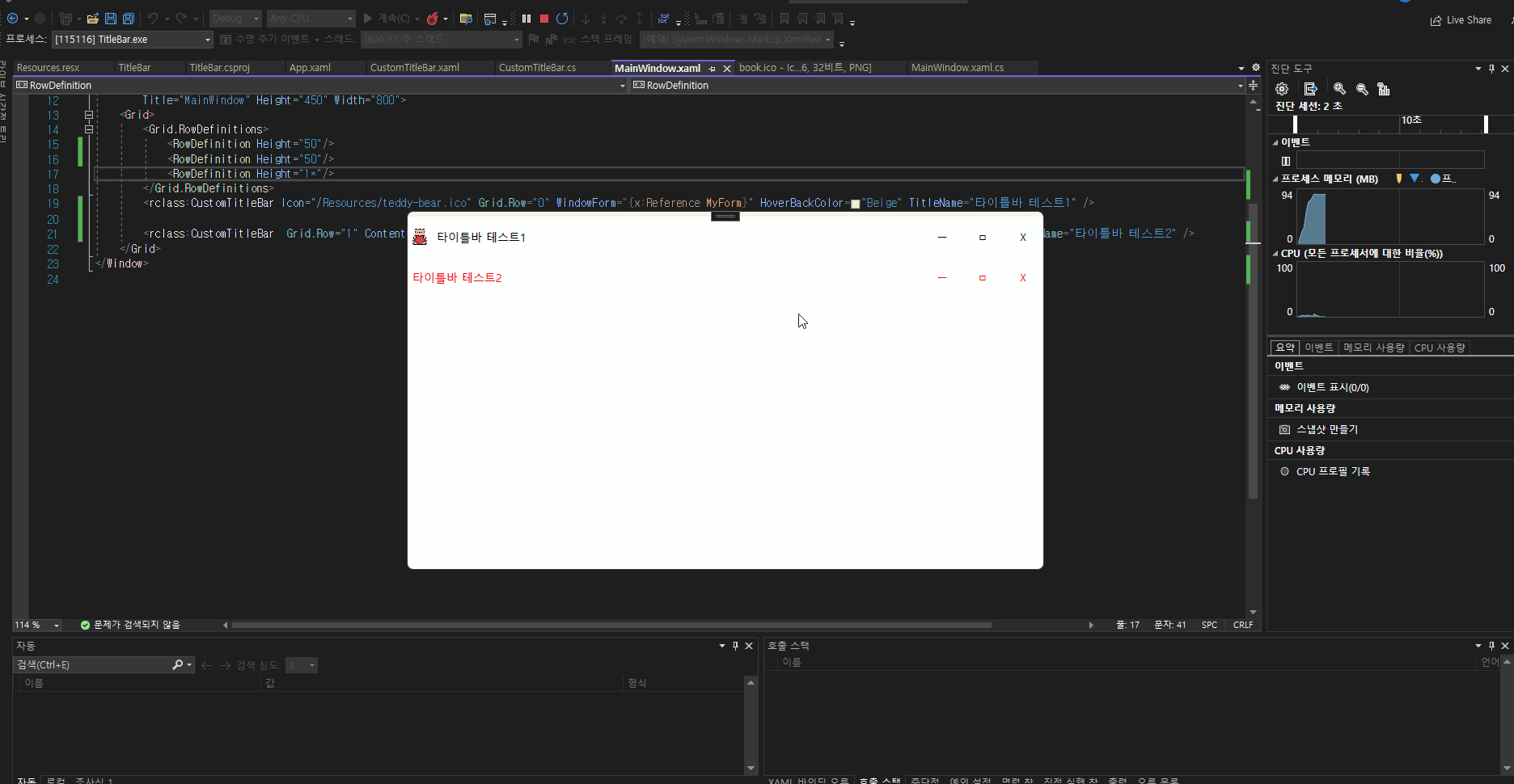 배경색 변경 및 폰트색 변경쪽 데이터를 받아오기위해 CustomTitleBar 리소스 클래스 코드에 존재하는 값을 바인딩 하기위해 아래와같이 추가해줬습니다.